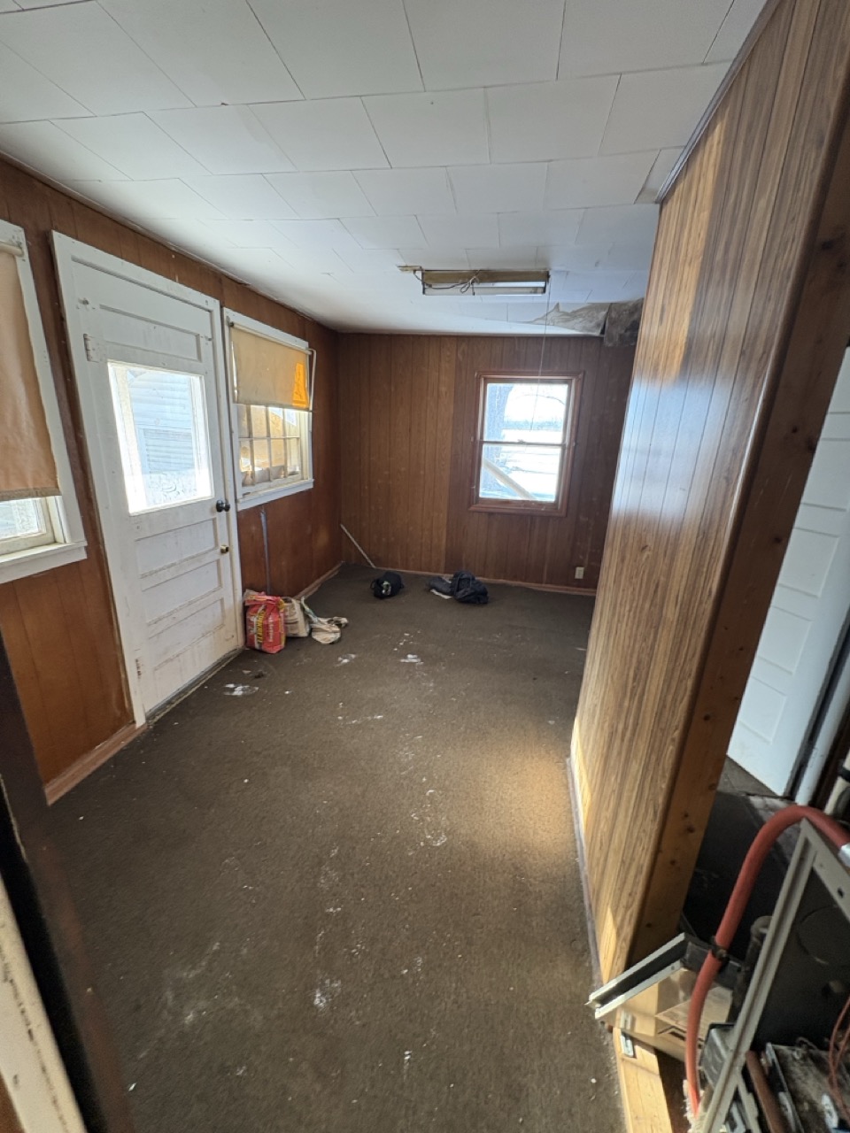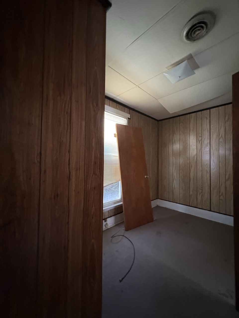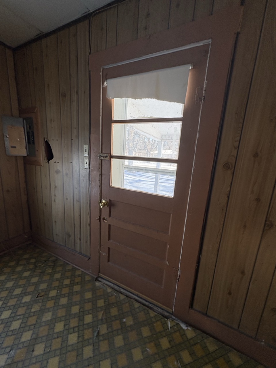 The home features classic wood paneling throughout and offers a cozy layout. Utilities are currently off.