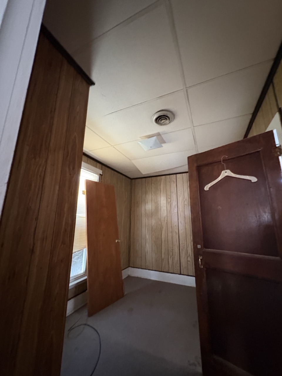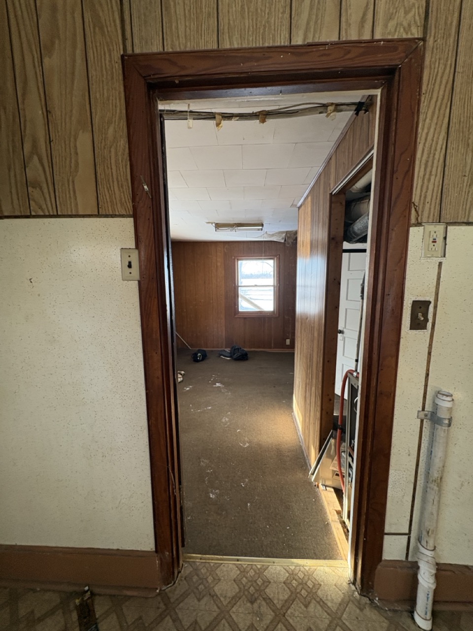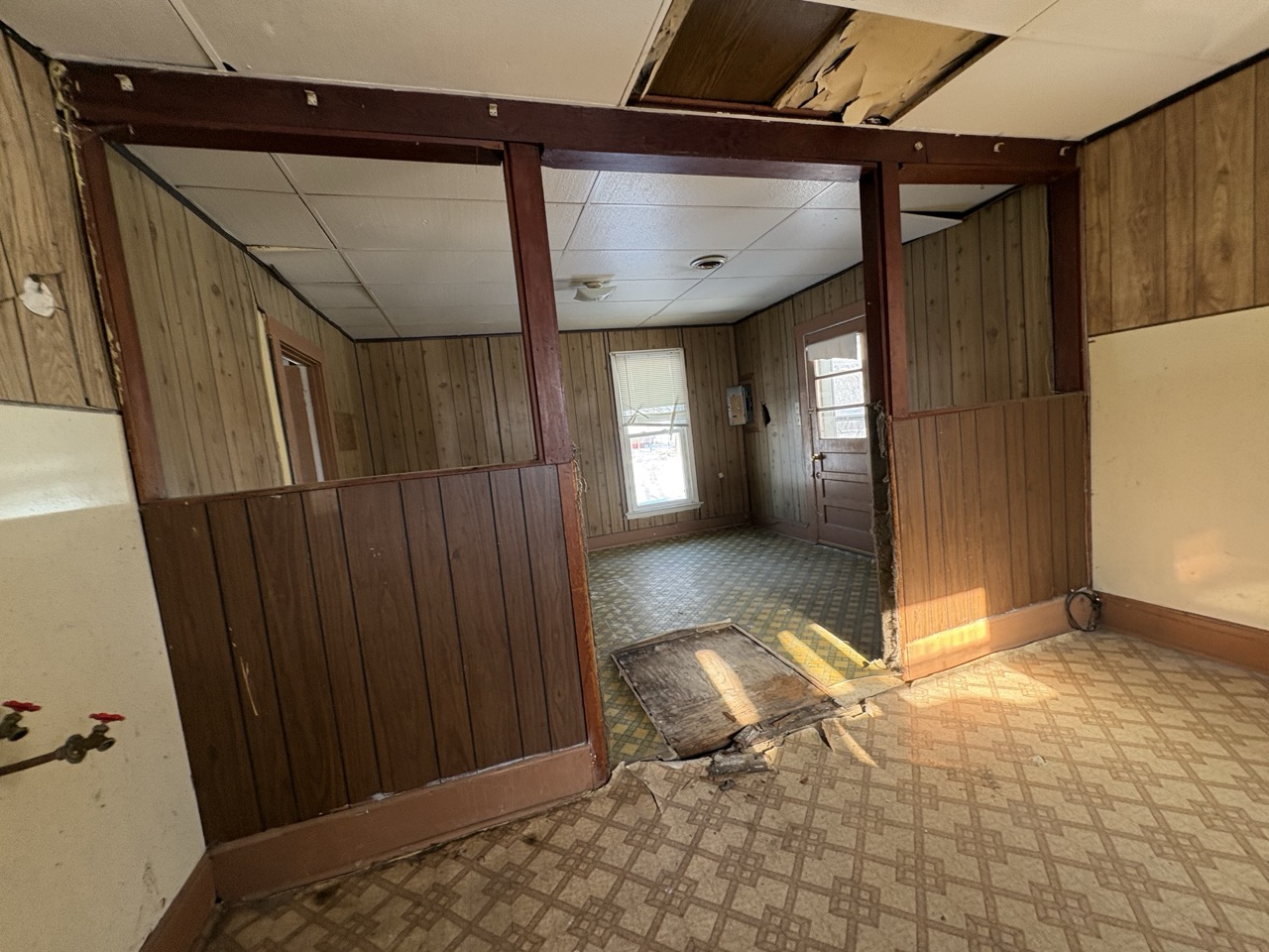 The home features classic wood paneling throughout and offers a cozy layout. Utilities are currently off.